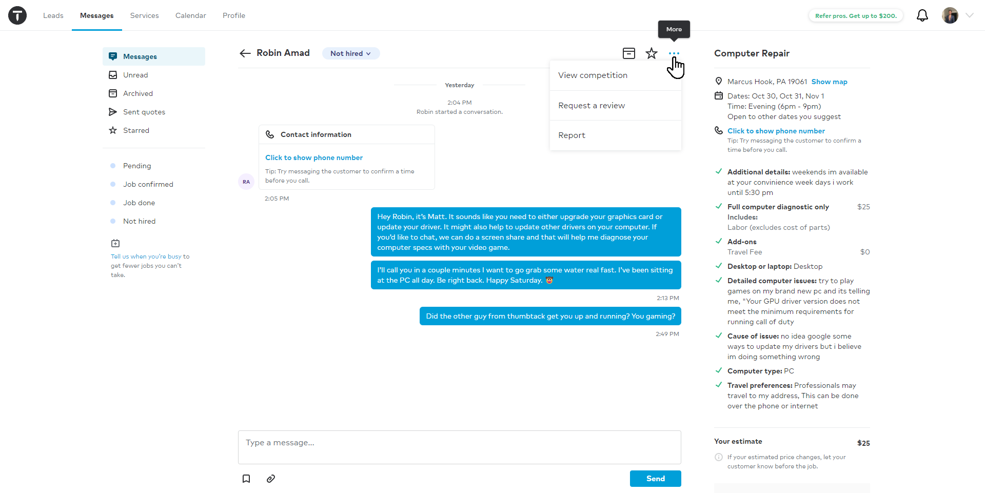 - I'm automatically billed for being sent (potential customer) contact info. Customer could be a bot , weak lead or good lead and is not billed for anything because it's UPTO Thumbtack service provider to capture everything.